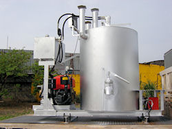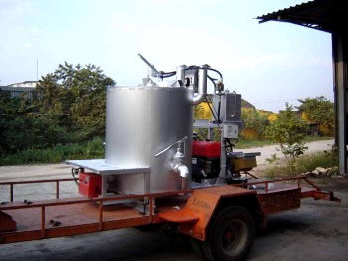 1. Tanque cilíndrico vertical com capacidade para 500 kg / 250 litros de termoplásticos, isolados termicamente com manta em lã de vidro ou rocha, equipado com termômetro para aferir a temperatura.